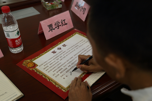 動員大會結(jié)束后,由各參建單位簽訂軍令狀,保證項(xiàng)目按期完成各項(xiàng)節(jié)點(diǎn),順利交付使用。最后,由富強(qiáng)公司總經(jīng)理程曦與華達(dá)裝飾公司負(fù)責(zé)人張波完成武漢建工科技中心項(xiàng)目部“大戰(zhàn)一百天”動員會揭牌儀式。