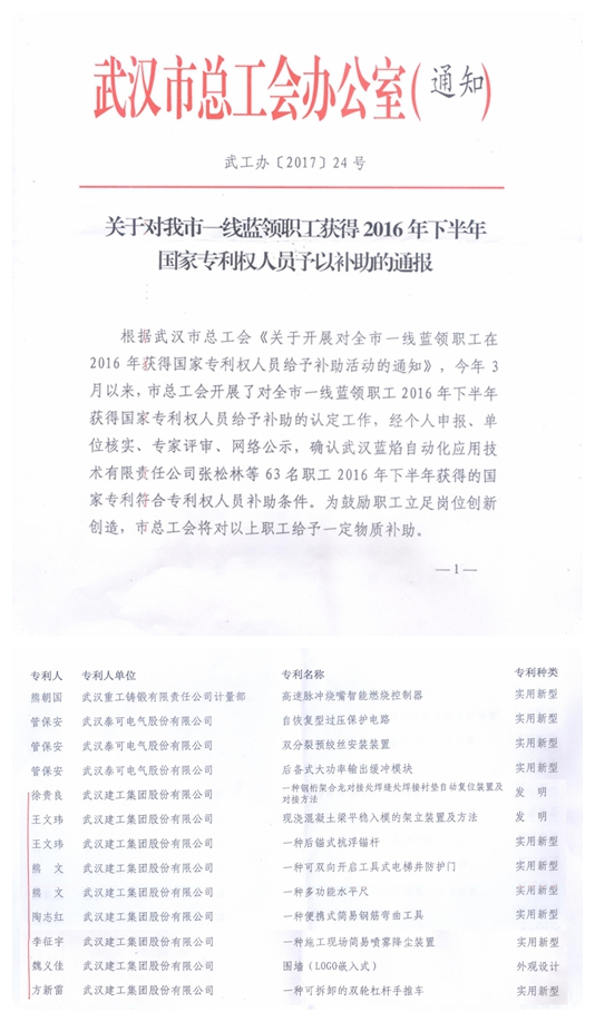 為鼓勵職工立足崗位創(chuàng)新創(chuàng)造,近日武漢市總工會對2016年下半年獲得國家專利權(quán)的一線職工發(fā)放了專利補助。經(jīng)過個人申報、單位核實、專家評審、網(wǎng)絡公示,全市共確認了63名具備補助條件的職工,其中武建集團的徐貴良、熊文、王文瑋等7位員工取得的《一種鋼桁架合攏對接處焊縫襯墊自動復位裝置及對接方法》等9項專利成果入選。