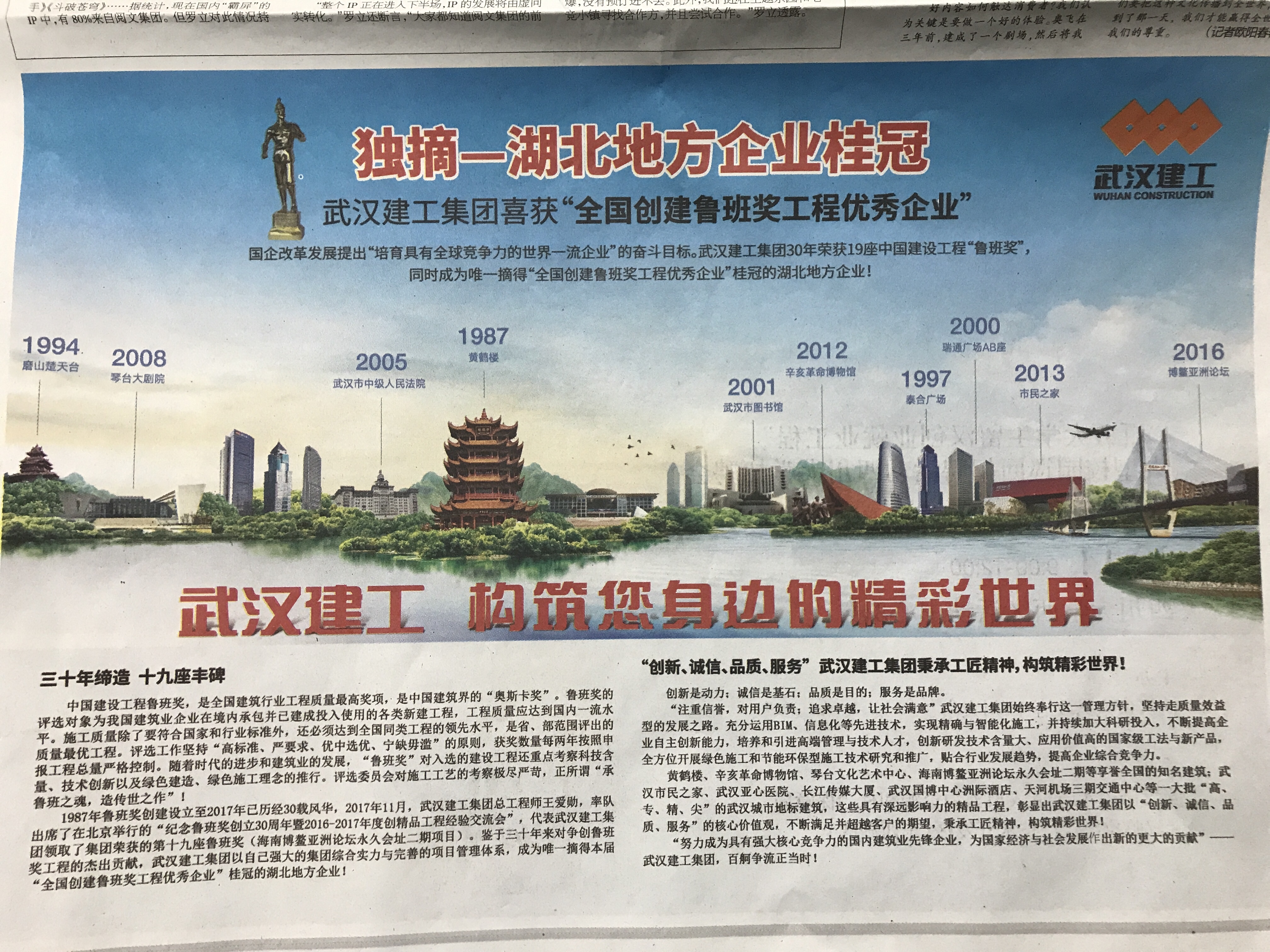 獨摘—湖北地方企業(yè)桂冠 武漢建工集團喜獲“全國創(chuàng)建魯班獎工程優(yōu)秀企業(yè)”