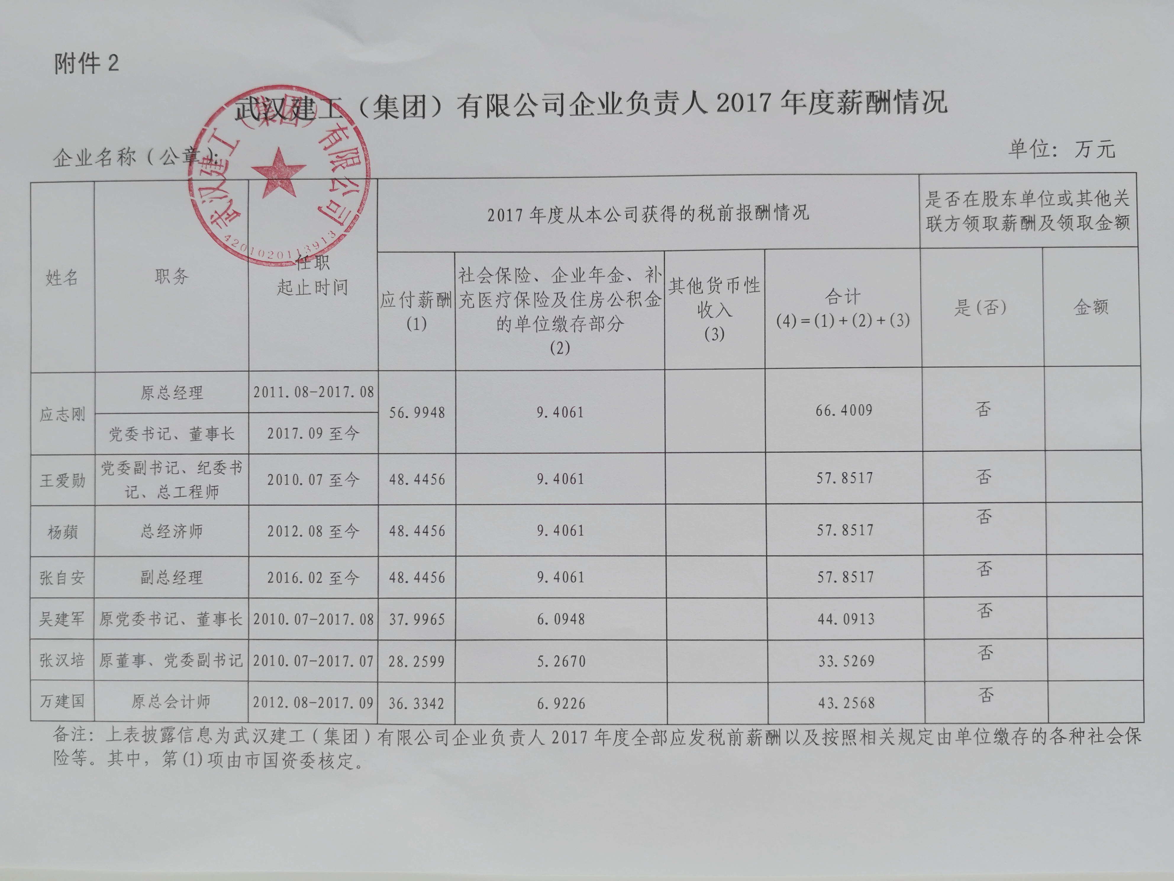 武漢建工(集團(tuán))有限公司企業(yè)負(fù)責(zé)人2017年度薪酬情況